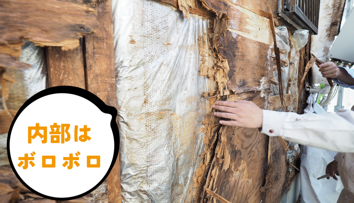 雨水が浸透した湿った環境は、シロアリの大好物です。シロアリは水なしでは生きられず、湿った木材の中に巣を作り栄養や水分を補給します。シロアリの発生は、建物の弱体化から倒壊のリスクが高まるため要注意です。