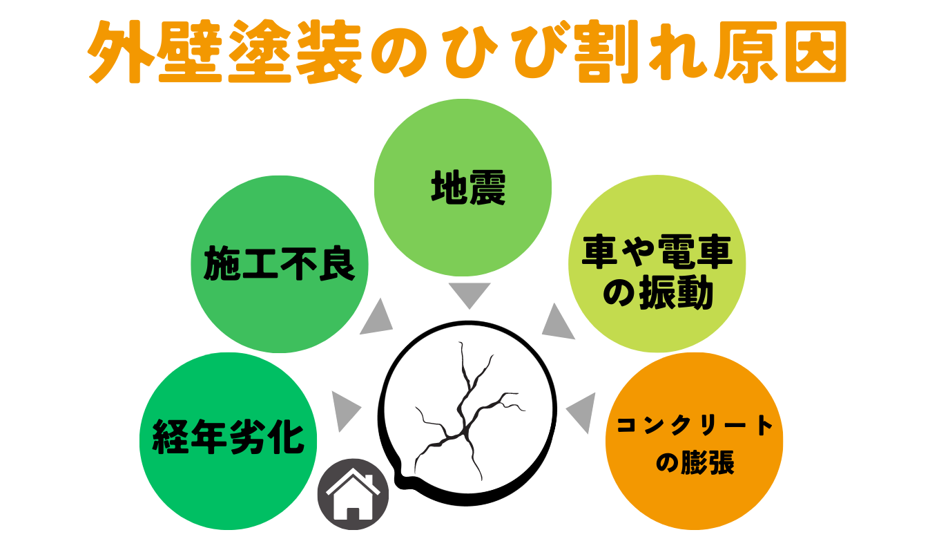 外壁塗装におけるひび割れの原因は主に5つです。今後の対策を考える際にも重要なので、ひび割れの原因に心当たりがないか、今一度確認してみましょう。