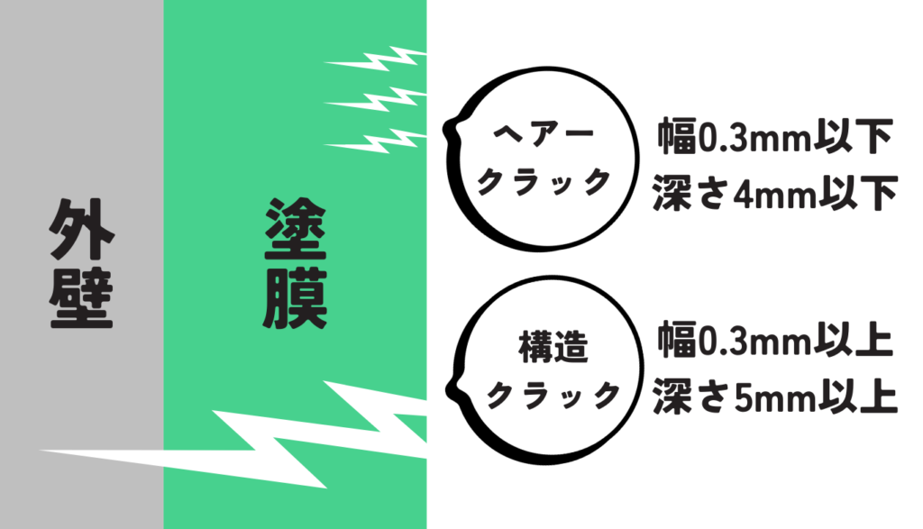 外壁塗装のひび割れには経過観察でよいひび割れ(ヘアークラック)と今すぐ補修が必要なひび割れ(構造クラック)の2種類があります。
