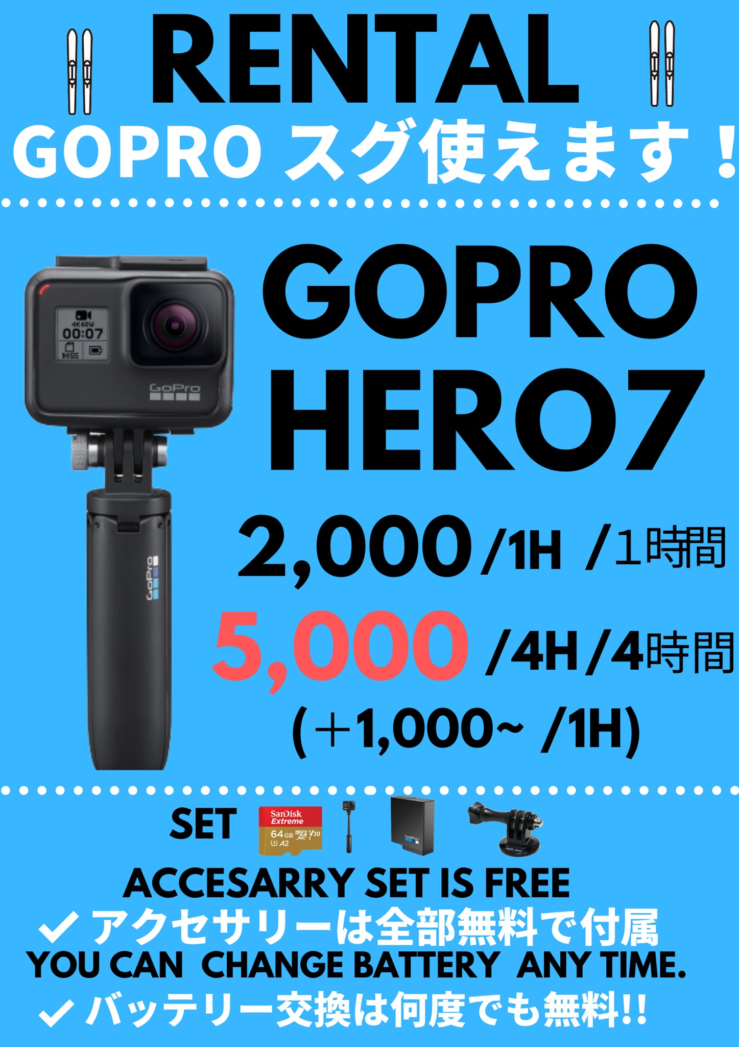 レンタルではGoPro Hero7をご用意しています。スキーやスノボしながら使える3-way(自撮り棒)、防水ハウジング、ヘルメットマウントなどのアクセサリーも全て揃っています。SDカードも無料でレンタルできるので、撮影後のデーターはそのままスマートフォンなどへの転送もできます。また別途2000円でそのままSDカードもご購入頂けます。