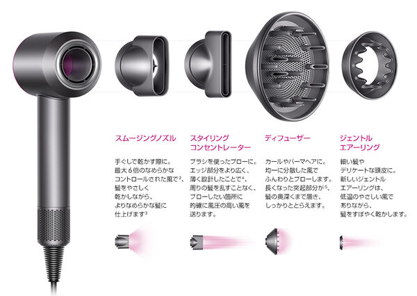 このようにダイソンでは、様々な髪質に対応してご希望の仕上がりになるよう研究に研究を重ねて設計された、自信作のアタッチメントを付属しています。