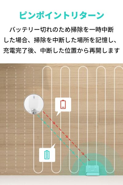 1回の充電で最長150分の運転が可能です。広い部屋でも充電を気にすることなく、十分に掃除ができますね。また、自動充電機能を搭載し、掃除中に充電が少なくなると、自動で充電場所へ戻って充電をし、充電が終わったら途中から掃除を再開してくれます。