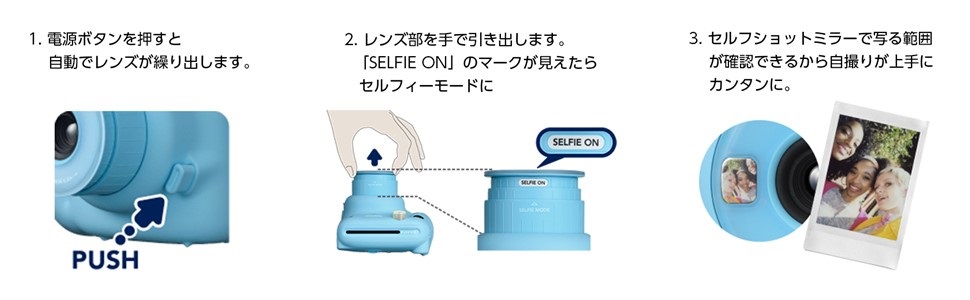 電源をオンにしてからレンズ部を手で引き出すだけでセルフィーモードに切り替えられます。